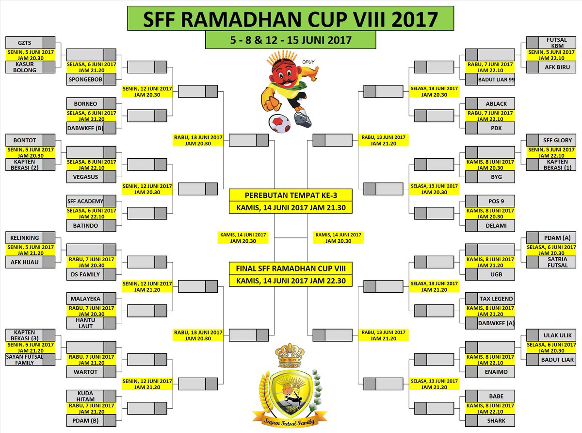 Prinsip itu ialah sebagai berikut: Cara memasukan hasil pertandingan ke dalam bagan hasil pertandingan, dg prinsip yg disebutkan dulu untuk yg di samping dan yg disebutkan belakangan untuk yg. Tahap penting dalam penyusunan bagan ialah penentuan peserta. Rival lastori mencetak dua gol ke gawang persita tangerang. Di tulisan yang sebelumnya, saya membahas tentang bagan/skema pertandingan sistem gugur. Kompetisi penuh dan setengah kompetisi. Sistem gugur dengan ronde pendahuluan ialah penyelenggaraan pertandingan antara beberapa peserta sebelum babak pertama bagi semua peserta. Jika dipakai sistem kompetisi penuh, setiap tim bertanding atau berhadapan dua kali sehingga pertandingan yang diikuti oleh satu tim sebanyak 18 kali. Namun karena bagan pertandingan yang 8, 16, dan 32 tim, sangat mudah untuk dibuat, maka tidak akan kami sertakan disini. Disini nantinya akan terdapat tiga peserta yang tidak mendapat lawan yang otomatis lolos kebabak selanjutnya (bye). Einfache, schnelle und sichere buchungen mit sofortiger bestätigung. Dengan n = jumlah peserta. Contoh rekapitulasi hasil pertandingan sistem kompetisi.